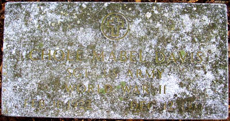 | DAVIS, CHOLE MABEL | FEB 11 1922 | DEC 12 1977 | "SGT US ARMY" "WORLD WAR II" Christian Cross in circle emblem |