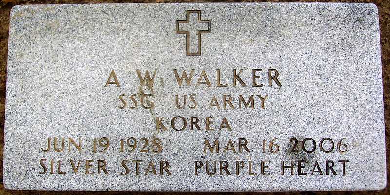 | WALKER, A. W. | JUN 19 1928 | MAR 16 2006 | "SSG US ARMY" "KOREA" "SILVER STAR PURPLE HEART" Christian Cross emblem |