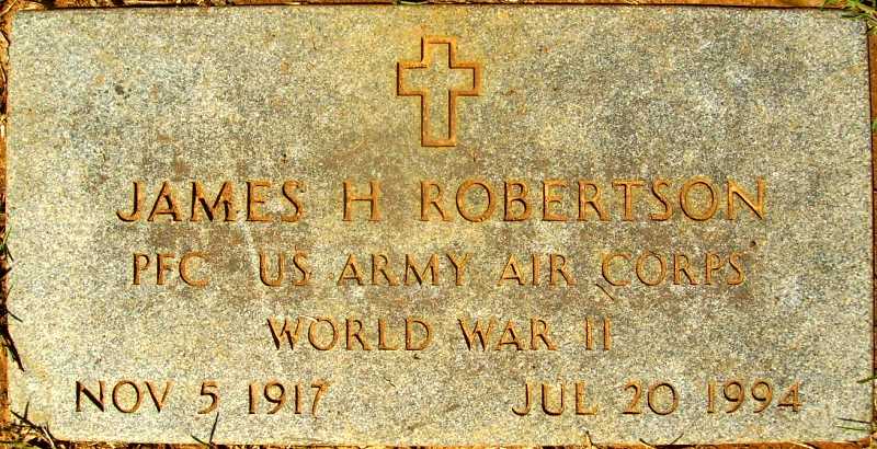 | ROBERTSON, JAMES H. | NOV 5 1917 | JUL 20 1994 | "PFC US ARMY AIR CORPS" "WORLD WAR II" Christian Cross emblem |