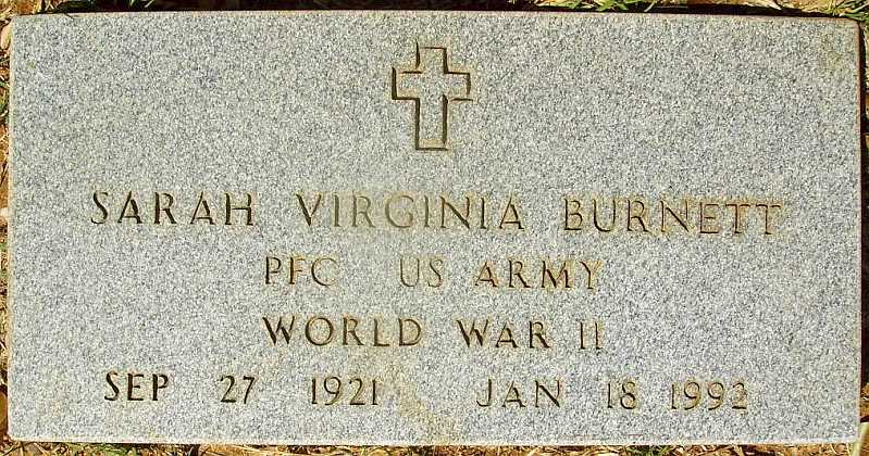 | BURNETT, SARAH VIRGINA | SEP 27 1921 | JAN 18 1992 | "PFC US ARMY" "WORLD WAR II" Christian Cross emblem |