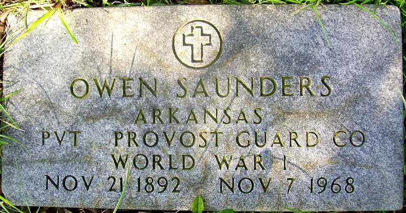| SAUNDERS, OWEN | NOV 21 1892 | NOV 7 1968 | "ARKANSAS" "PVT PROVOST GUARD CO" "WORLD WAR I" Christian Cross in circle emblem |