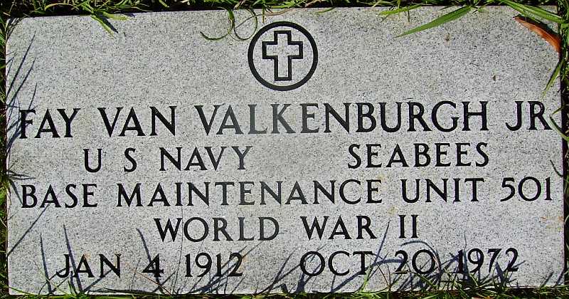 | VAN VALKENBURGH, FAY, JR. | JAN 4 1912 | OCT 20 1972 | "U S NAVY SEABEES" "BASE MAINTENANCE UNIT 501" "WORLD WAR II" Christian Cross in circle emblem |