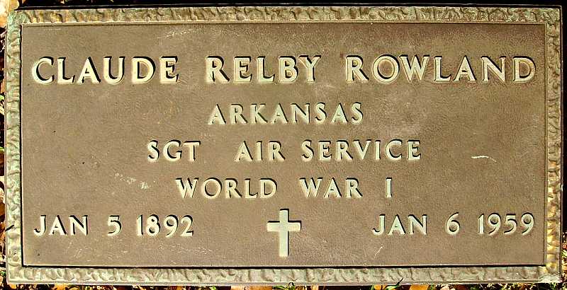 | ROWLAND, CLAUDE RELBY | JAN 5 1892 | JAN 6 1959 | "ARKANSAS" "SGT AIR SERVICE" "WORLD WAR I" Christian Cross emblem |