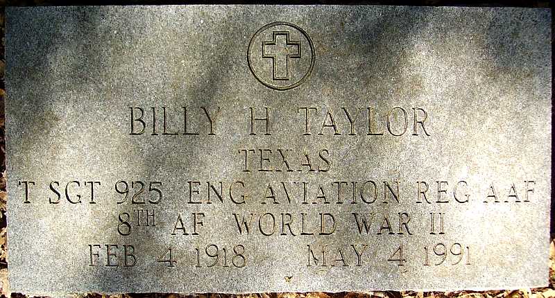 | TAYLOR, BILLY H. | FEB 4 1918 | MAY 4 1991 | "TEXAS" "T SGT 925 ENG AVIATION REG AAF" "8TH AF WORLD WAR II" Christian Cross in circle emblem |