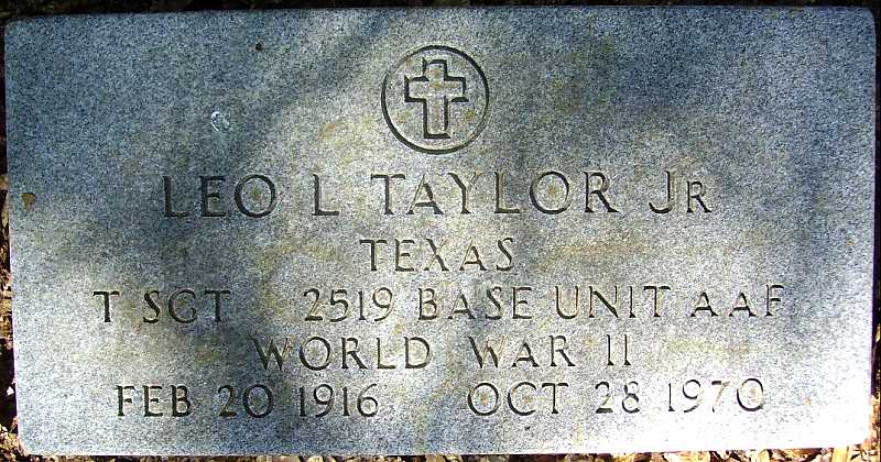 | TAYLOR, LEO L., JR. | FEB 20 1916 | OCT 28 1970 | "TEXAS" "T SGT 2519 BASE UNIT AAF" "WORLD WAR II" Christian cross in circle emblem |