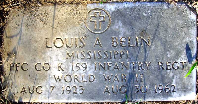 | BELIN, LOUIS A. | AUG 7 1923 | AUG 30 1962 | "MISSISSIPPI" "PFC CO K 159 INFANTRY REGT" "WORLD WAR II" Christian Cross in circle emblem |