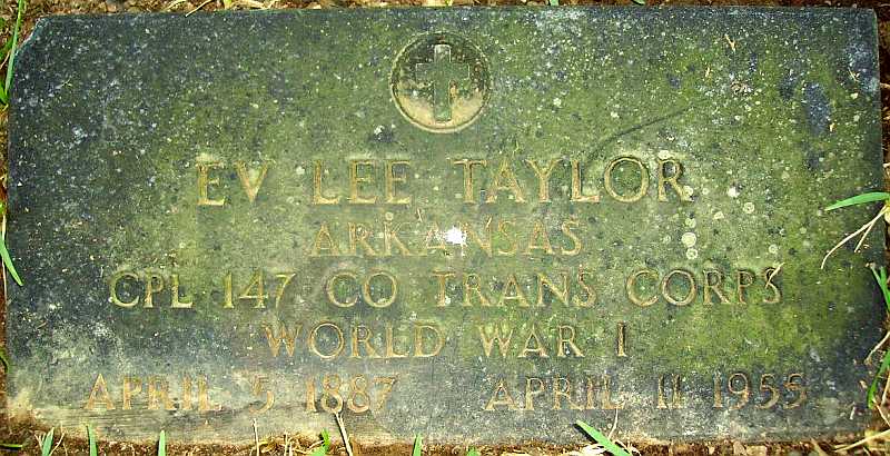 | TAYLOR, EV LEE | APRIL 5 1887 | APRIL 11 1955 | "ARKANSAS "CPL 147 CO TRANS CORPS" "WORLD WAR I" Christian Cross in circle emblem |