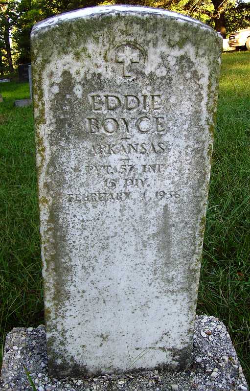 | BOYCE, EDDIE | [ Oct. 14, 1895 ] | FEBRUARY 4, 1936 | "ARKANSAS" "PVT. 57 INF." "15 DIV." Christian Cross in circle emblem |