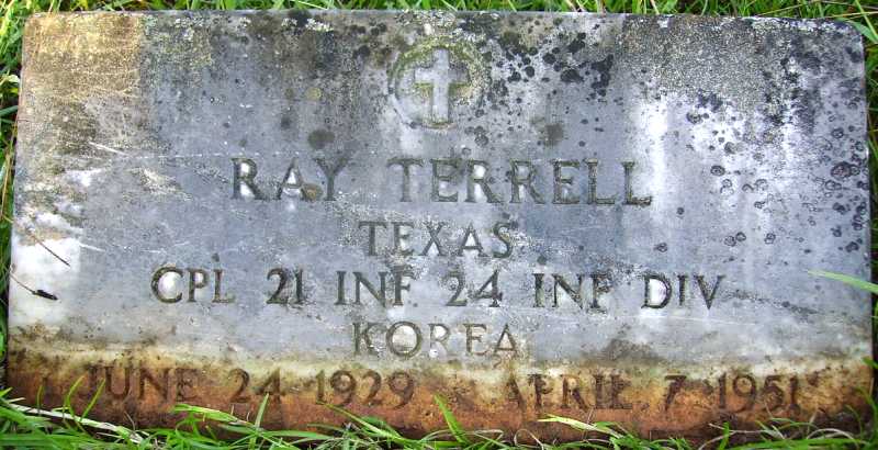 | TERRELL, RAY | JUNE 24 1929 | APRIL 7 1951 | "TEXAS" "CPL 21 INF 24 INF DIV" "KOREA" Chrisitian Cross in circle emblem |