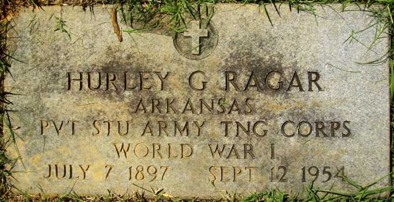 | RAGAR, HURLEY G. | JULY 7 1897 | SEPT 12 1954 | "ARKANSAS" "PVT STU ARMY TNG CORPS" "WORLD WAR I" Christian Cross in circle emblem |