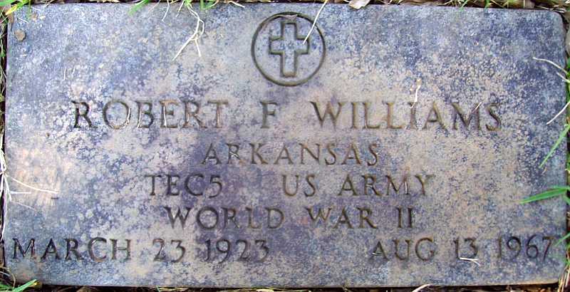 | WILLIAMS, ROBERT F. | MARCH 23 1923 | AUG 13 1967 | "ARKANSAS" "TEC5 US ARMY" "WORLD WAR II" Chrisitan Cross in circle emblem |