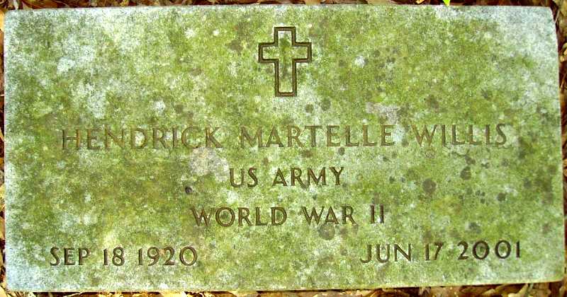| WILLIS, HENDRICK MARTELLE | SEP 18 1920 | JUN 17 2001 | "US ARMY" "WORLD WAR II" Christian Cross emblem |