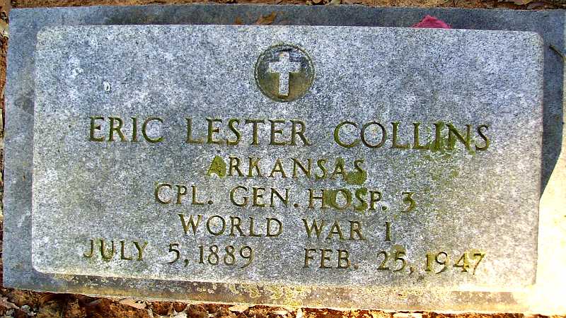 | COLLINS, ERIC LESTER | JULY 5, 1889 | FEB. 25, 1947 | "ARKANSAS" "CPL. GEN. HOSP. 3" "WORLD WAR I" Christian Cross in circle emblem |
