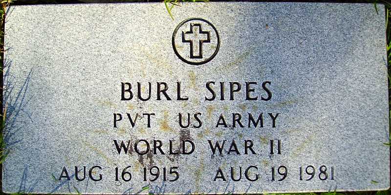 | SIPES, BURL | AUG 16 1915 | AUG 19 1981 | "PVT US ARMY" "WORLD WAR II" Christian Cross in circle emblem |