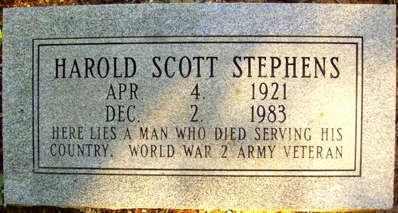 | STEPHENS, HAROLD SCOTT | APR. 4, 1921 | DEC. 2, 1983 | "HERE LIES A MAN WHO DIED SERVING HIS COUNTRY. WORLD WAR 2 ARMY VETERAN" |