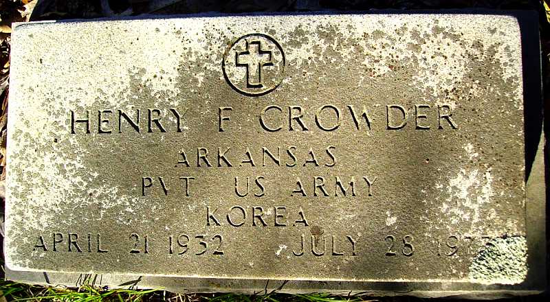 | CROWDER, HENRY F. | APRIL 21 1932 | JULY 28 1977 | "ARKANSAS" "PVT US ARMY" "KOREA" Christian Cross in circle emblem |