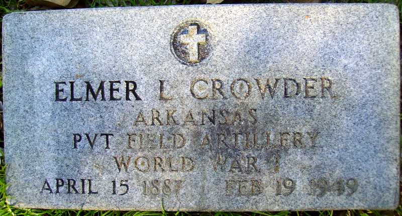 | CROWDER, ELMER L. | APRIL 15 1887 | FEB 19 1949 | "ARKANSAS" "PVT FIELD ARTILLERY" "WORLD WAR I" Christian Cross in circle emblem |