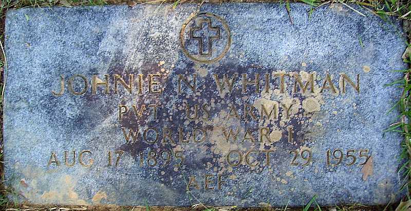 | WHITMAN, JOHNIE N. | AUG 17 1895 | OCT 29 1955 | "PVT US ARMY" "WORLD WAR I" "AEF" Christian Cross in circle emblem |