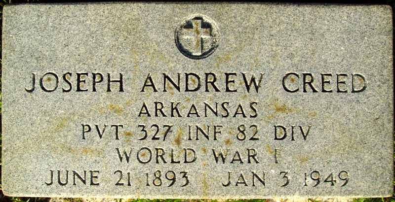 | CREED, JOSEPH ANDREW | JUNE 21 1893 | JAN 3 1949 | "ARKANSAS" "PVT 327 INF 82 DIV" "WORLD WAR I" Christian Cross in circle emblem |