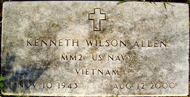 | ALLEN, KENNETH WILSON | NOV 10 1943 | AUG 12 2000 | "MM2 US NAVY" "VIETNAM" Christian Cross emblem |