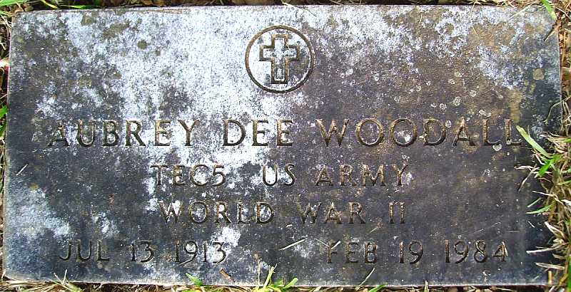 | WOODALL, AUBREY DEE | JUL 13 1913 | FEB 19 1984 | "TEC5 US ARMY" "WORLD WAR II" Christian Cross in circle emblem |