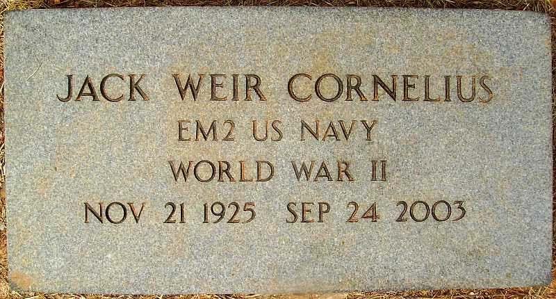 | CORNELIUS, JACK WEIR | NOV 21 1925 | SEP 24 2003 | "EM2 US NAVY" "WORLD WAR II" |