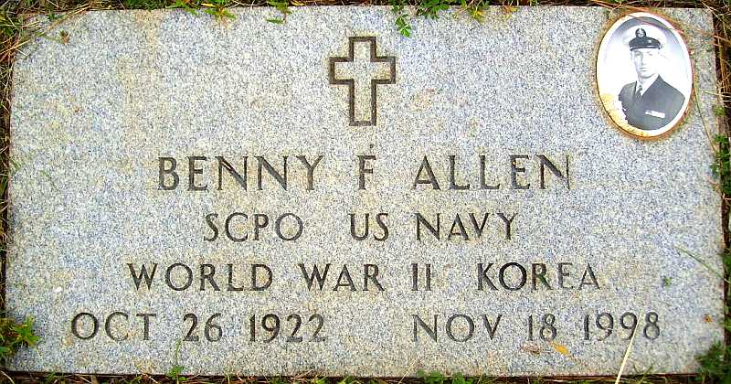 | ALLEN, BENNY F. | OCT 26 1922 | NOV 18 1998 | "SCPO US NAVY" "WORLD WAR II KOREA" Christian Cross emblem, Photo with a bit of damage |