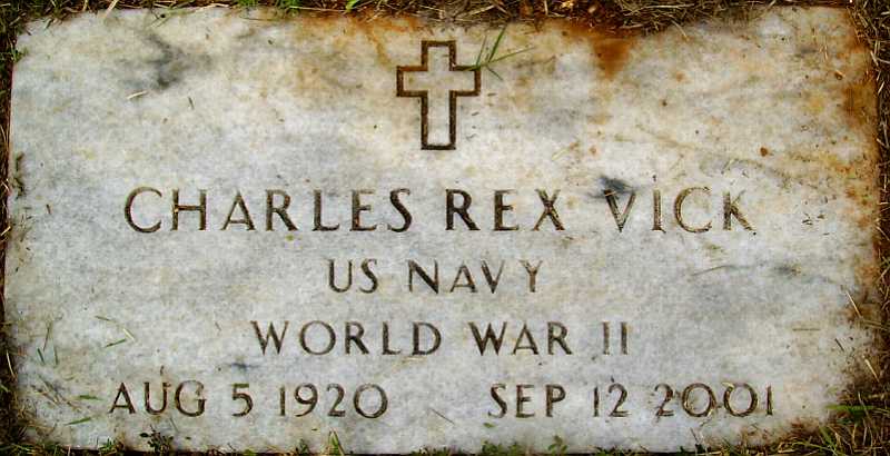| VICK, CHARLES REX | AUG 5 1920 | SEP 12 2001 | "US NAVY" "WORLD WAR II" Christian Cross emblem |