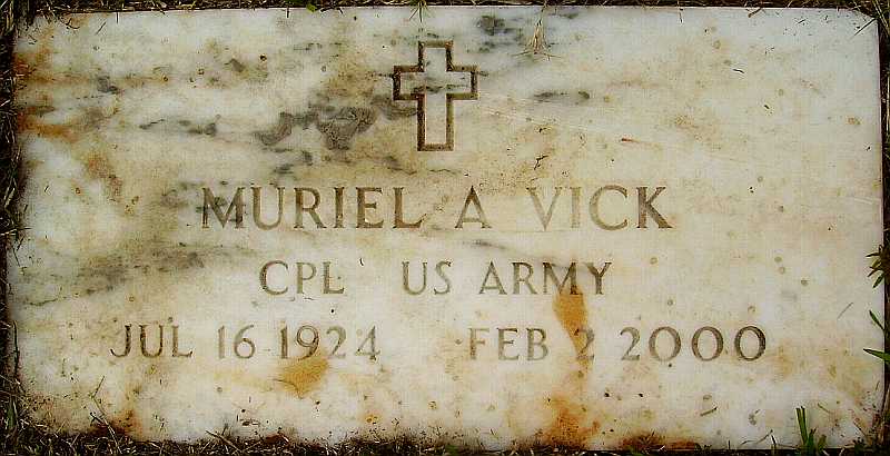 | VICK, MURIEL A. | JUL 16 1924 | FEB 2 2000 | "CPL US ARMY" Christian Cross emblem |