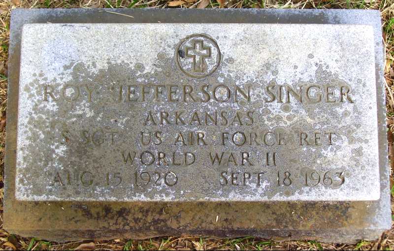| SINGER, ROY JEFFERSON | AUG 15 1920 | SEPT 18 1963 | "S SGT US AIR FORCE RET" "WORLD WAR II" Christian Cross in circle emblem |