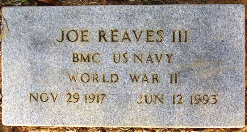 | REAVES, JOE III | NOV 29 1917 | JUN 12 1993 | "BMC US NAVY" "WORLD WAR II" |