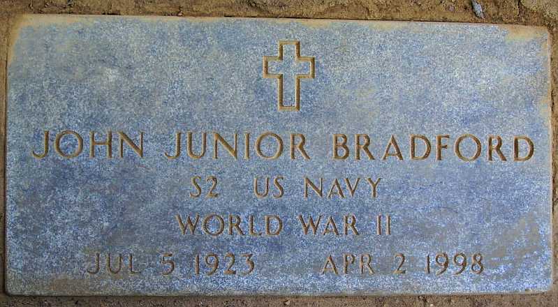 | BRADFORD, JOHN JUNIOR | JUL 5 1923 | APR 2 1998 | "S2 US NAVY" "WORLD WAR II" Christian Cross emblem |