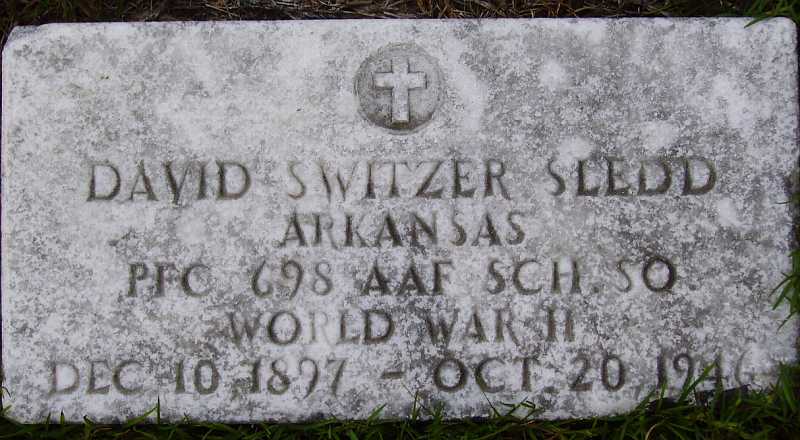 | SLEDD, DAVID SWITZER | DEC 10 1897 | OCT 20 1946 | "ARKANSAS" "PFC. 698 AAF SCH. SO" "WORLD WAR II" Cross in circle emblem |