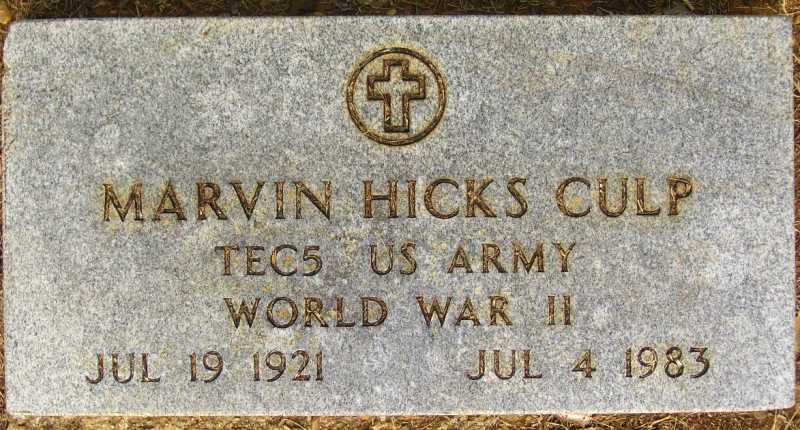 | CULP, MARVIN HICKS | JUL 19 1921 | JUL 4 1983 | "TEC5 US ARMY" "WORLD WAR II" Christian Cross in circle emblem |