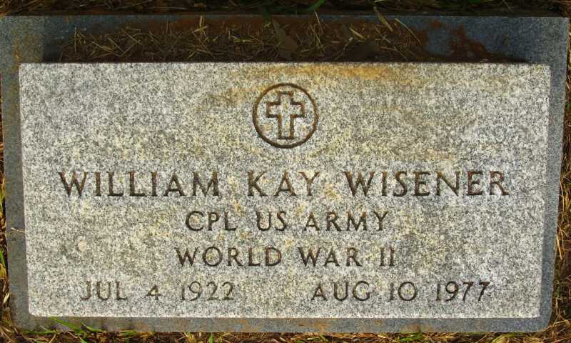 | WISENER, WILLIAM KAY | JUL 4 1922 | AUG 10 1977 | "CPL US ARMY" "WORLD WAR II" Christian Cross in circle emblem |