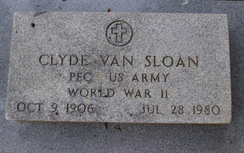 | SLOAN, CLYDE VAN | OCT 9 1906 | JUL 28 1980 | "PFC US ARMY" "WORLD WAR II" Christian Cross in circle emblem |