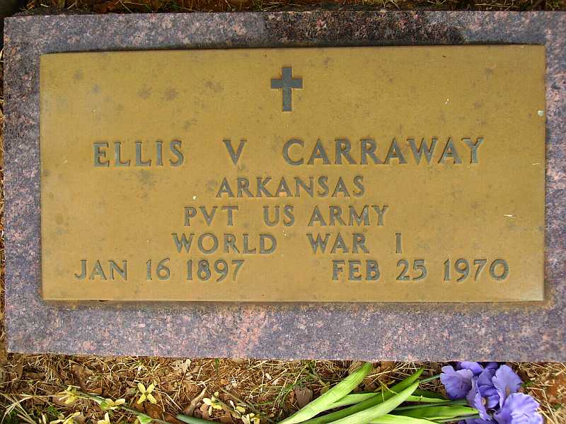 | CARRAWAY, ELLIS V. | JAN 16 1897 | FEB 25 1970 | "ARKANSAS" "PVT US ARMY" "WORLD WAR I" Christian Cross emblem |