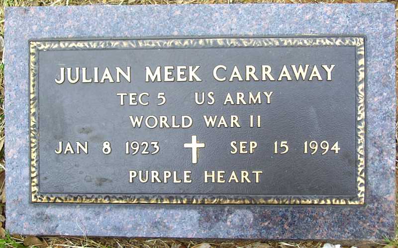 | CARRAWAY, JULIAN MEEK | JAN 8 1923 | SEP 15 1994 | "TEC 5 US ARMY"" "WORLD WAR II" "PURPLE HEART" Christian Cross emblem |