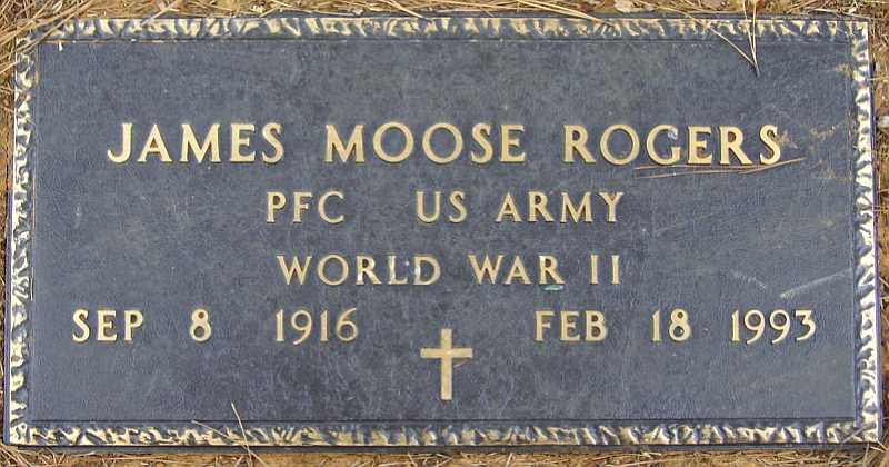 | ROGERS, JAMES MOOSE | SEP 8 1916 | FEB 18 1993 | "PFC US ARMY" "WORLD WAR II" Christian Cross emblem |