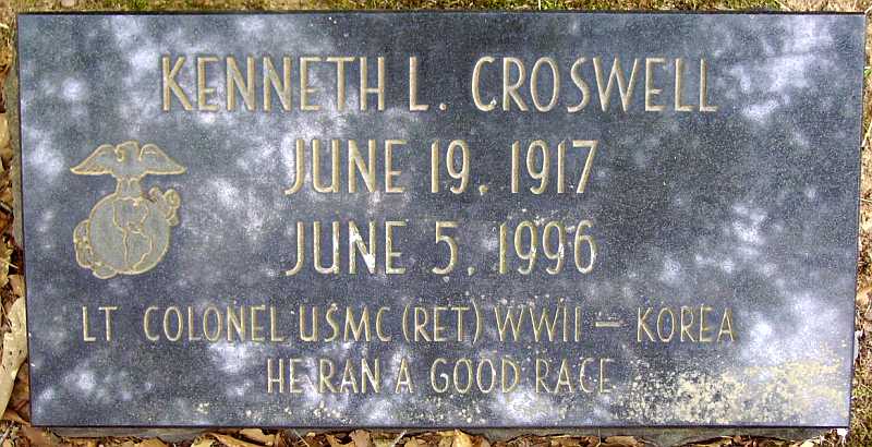 | CROSWELL, KENNETH L. | JUNE 19, 1917 | JUNE 5, 1996 | "LT COLONEL USMC (RET) WWII - KOREA" "HE RAN A GOOD RACE" Marine Corps emblem |