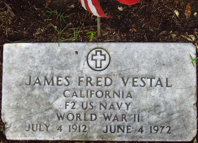 | VESTAL, JAMES FRED | JULY 4 1912 | JUNE 4 1972 | "CALIFORNIA" "F2 US NAVY" "WORLD WAR II" Christian Cross in circle emblem |