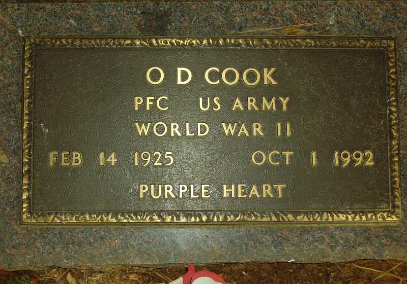 | COOK, O. D. | FEB 14 1925 | OCT 1 1992 | "PFC US ARMY" "WORLD WAR II" "PURPLE HEART" |