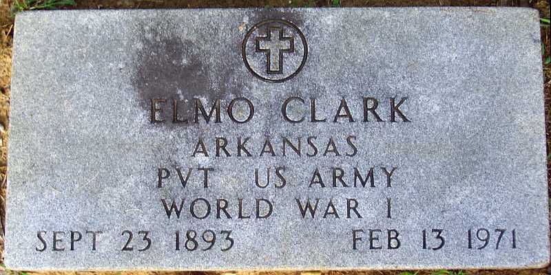 | CLARK, ELMO | SEPT 23 1893 | FEB 13 1971 | "ARKANSAS" "PVT US ARMY" "WORLD WAR I" Christian Cross in circle emblem |