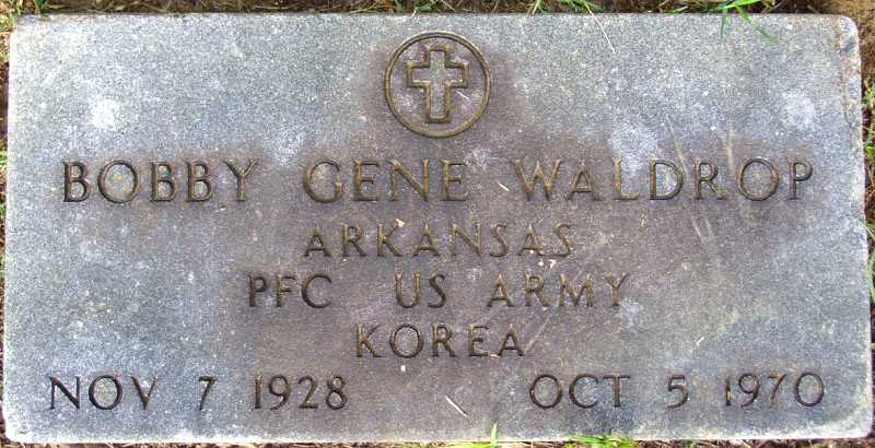 | WALDROP, BOBBY GENE | VOV 7 1928 | OCT 5 1970 | "ARKANSAS" "PFC US ARMY" "KOREA" Christian Cross in circle emblem |