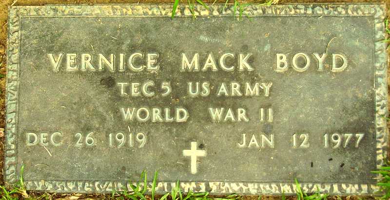| BOYD, VERNICE MACK | DEC 26 1919 | JAN 12 1977 | "TEC5 US ARMY" "WORLD WAR II" Christian Cross emblem |