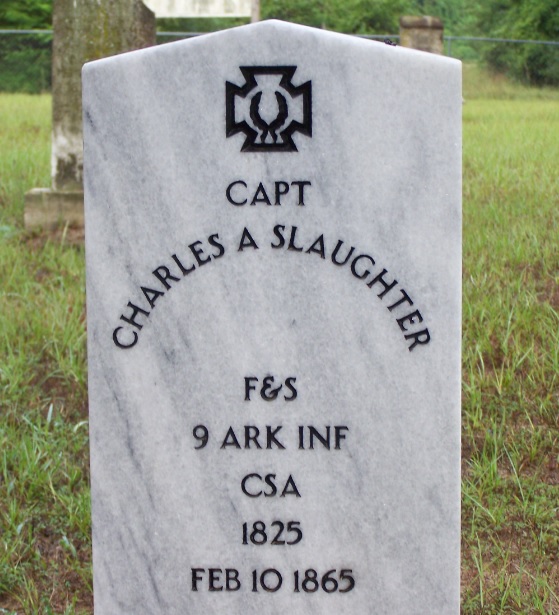 | Charles A. Slaughter - NEW PHOTOS! 11-1-2015 | 1825 | 2-10-1865 | Military Stone "CAPT" "F & S 9 ARK INF CSA" Cross garland emblem [First husband of Mary Jane Bond Packard; Great great grandfather of Bobby Slaughter]New Charles A. Slaughter stone now beside her stone | DP, PS & LH | |