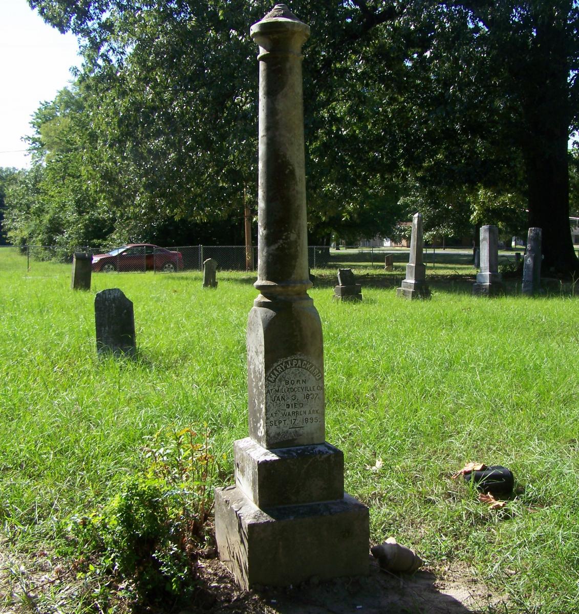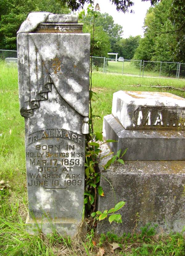 | Dr. A. L. Marr | 3-17-1853 | 6-10-1889 | "BORN IN HOLLY SPRINGS MISS" "DIED AT WARREN ARK" [h/o Mary S. Marr] | DP & LH | |