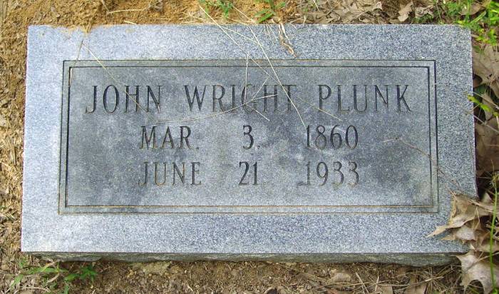 | John Wright Plunk | 3-3-1860 | 6-21-1933 | Another Photo; Third photo; Located off to the side of the cemetery | RB & LH | |