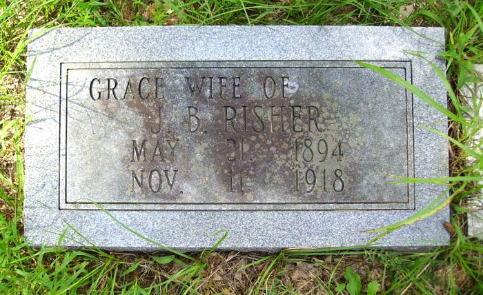 | Grace Risher | 5-21-1894 | 11-11-1918 | "WIFE OF J. B. RISHER" | DP & LH | |