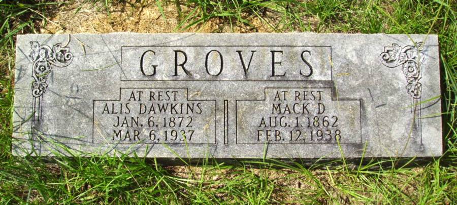 | Mack D. Groves | 8-1-1862 | 2-12-1938 | Double Stone with Alis Dawkins Groves "AT REST" | DP & LH | |